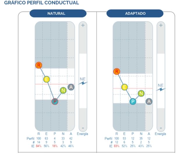 Podemos ver que las personas tenemos un Perfil Natural, que se refiere a cómo nos comportamos de manera, justamente, natural y otro que es el Perfil Adaptado que tiene en cuenta como nuestro entorno (en este caso nuestro trabajo) nos condiciona llevando nuestros comportamientos a diferentes niveles, según sean los desafíos a enfrentar.