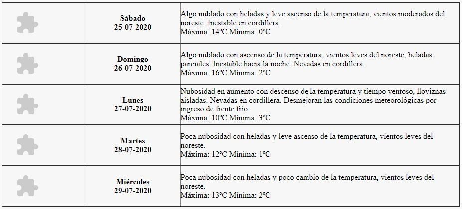De acuerdo al pronóstico de Contingencias Climáticas, este sábado estará algo nublado con heladas y leve ascenso de la temperatura, vientos moderados del noreste. Inestable en cordillera".