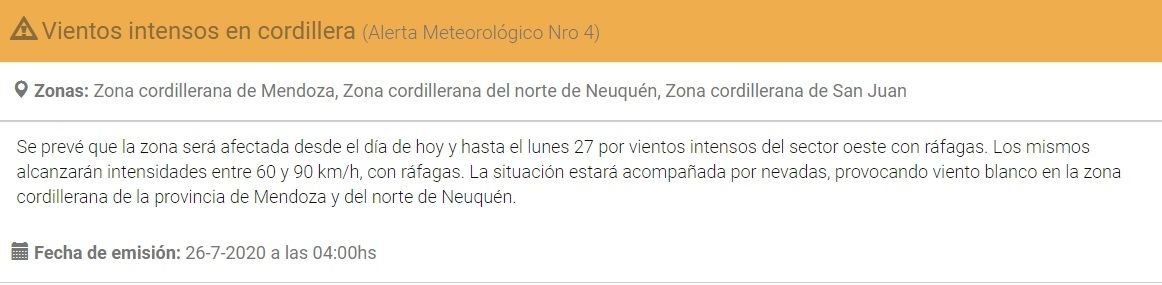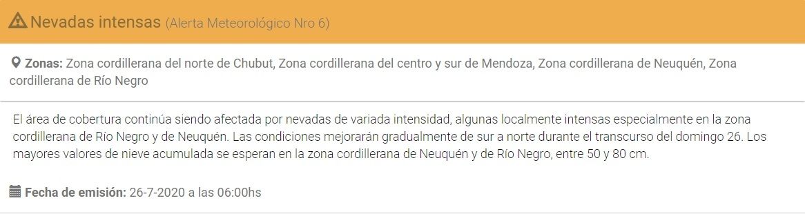 El primer alerta refiere a la ocurrencia de "nevadas intensas" y abarca la zona cordillerana del centro y sur de Mendoza, y las zonas cordilleranas del norte de Chubut, Neuquén y Río Negro. Dichas nevadas serán "de variada intensidad" aunque las condiciones comenzarán a mejorar en el transcurso de hoy.
