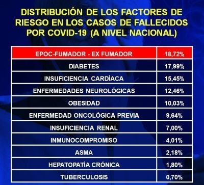 Los indicadores a nivel nacional muestran la incidencia directa del tabaquismo en el número de víctimas fatales que hasta este momento son 3.082. Tras este factor de comorbilidad, se encuentra la diabetes (con un 17,99 %), la insuficiencia cardíaca (15,45%), las enfermedades neurológicas (12,46%,) y la obesidad (19,93%) entre las causas más peligrosas.