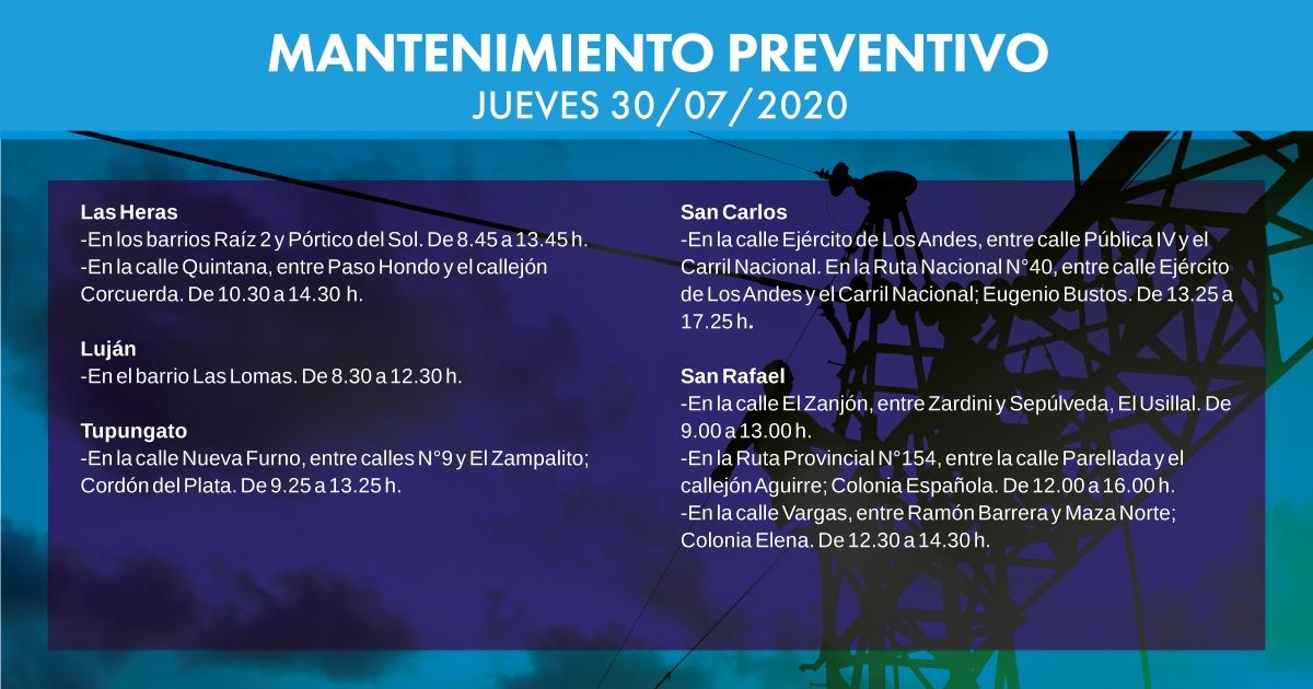 Hoy habrá afectación del servicio eléctrico en las siguientes zonas y horarios. Estas tareas de Edemsa  se realizan bajo los protocolos sanitarios establecidos para Covid-19.