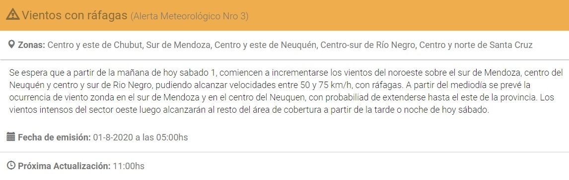 El alerta fue emitido por el Servicio Meteorológico Nacional, desde donde previeron para la tarde de hoy vientos intensos en la zona de cordillera y precordillera que alcanzarían los 80 km/h. "Esta situación estará acompañada de viento blanco en la zona cordillerana de Neuquén", reza el comunicado.