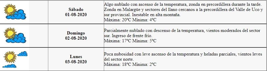 "Algo nublado con ascenso de la temperatura, Zonda en precordillera durante la tarde. Zonda en Malargüe y sectores del llano cercanos a la precordillera del Valle de Uco y sur provincial. Inestable en alta montaña. Máxima: 20ºC Mínima: 4ºC" es la estimación del organismo provincial.