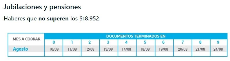 El primer grupo en cobrar son los jubilados que perciben menos de $18.952. Hoy cobra el grupo cuyo DNI termina en 0. El calendario seguirá avanzando hasta el 24 de este mes, cuando cobren quienes tienen el documento terminado en 9.