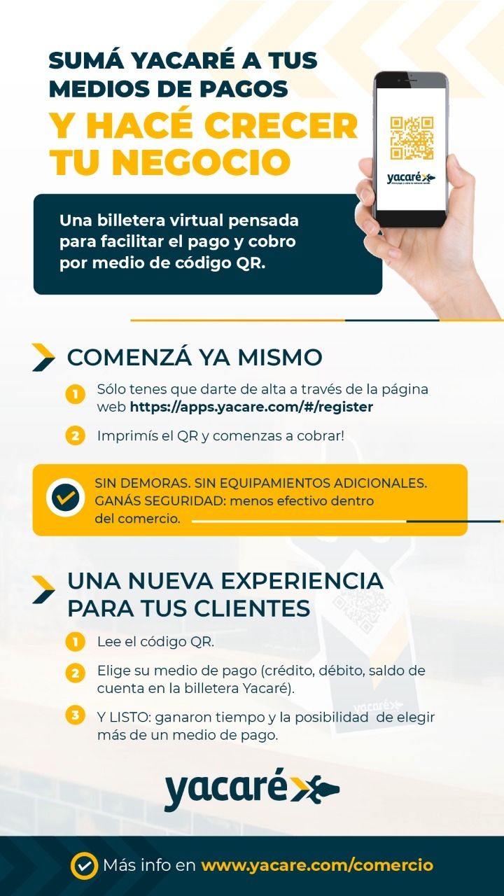 Los comerciantes deben realizar su proceso de registración mediante la web de Yacaré: www.yacare.com. Una vez completados los datos de identidad y facturación del comercio, el comerciante debe dirigirse a una pestaña del sitio web para imprimir el código QR con el cual se identificarán todas las operaciones comerciales que se cobren con Yacaré.