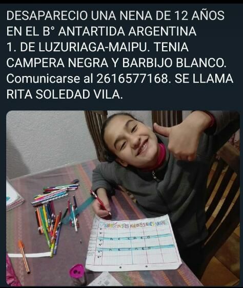 Según contó la abuela de la pequeña, Rita Soledad Vila se encontraba barriendo la vereda de su casa, ubicada en la calle Orcadas al 2021, y de repente desapareció en horas del mediodía. Tenía puesta una campera negra, un pantalón negro y un barbijo blanco.
