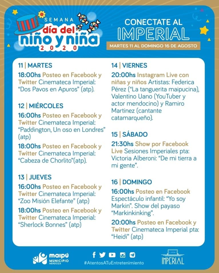 Además, habrá un Instagram Live en sus habituales Viernes de charlas del #ConectateAlImperial, con una niña maipucina, Federica Pérez, “la tanguerita maipucina” y dos niños también artistas: el YouTuber y actor mendocino, Valentino Uano y con el cantante catamarqueño Ramiro Martínez.