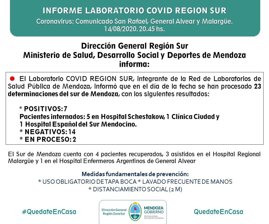 Según el informe diario de la Dirección Regional Sur del Ministerio de Salud, Desarrollo Social y Deportes de la provincia, el laboratorio COVID que funciona en el sur procesó hoy un total de 23 determinaciones, de las cuales 7 dieron resultado positivo.