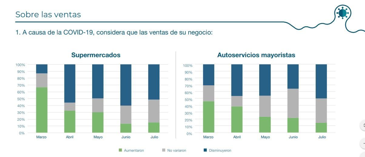 En los datos de julio, la mayoría de los supermercados, el 85%, afirmó que sus ventas disminuyeron o no variaron estos meses. De estos, el 51,5% aseguraron que disminuyeron y que más de la mitad de estos, consideraron que las caídas alcanzaron hasta un 20%.