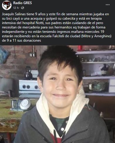 "Joaquín Salinas tiene 9 años y este fin de semana mientras jugaba en su bici cayó a una acequia y golpeó su cabecita y está en terapia intensiva del hospital Notti. Sus padres están cuidando de él pero necesitan de mercadería para sus hermanitos porque trabajan de forma independiente y no están teniendo ingresos", indica la convocatoria que se difundió en redes sociales.