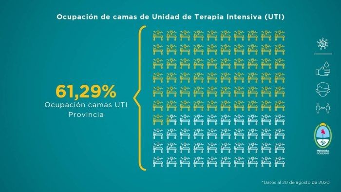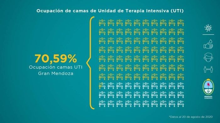 La provincia cuenta con un total de 350 camas críticas. En cuanto al factor ocupacional, el Gran Mendoza es de 70,59% y de 61,29% en todo el territorio mendocino.