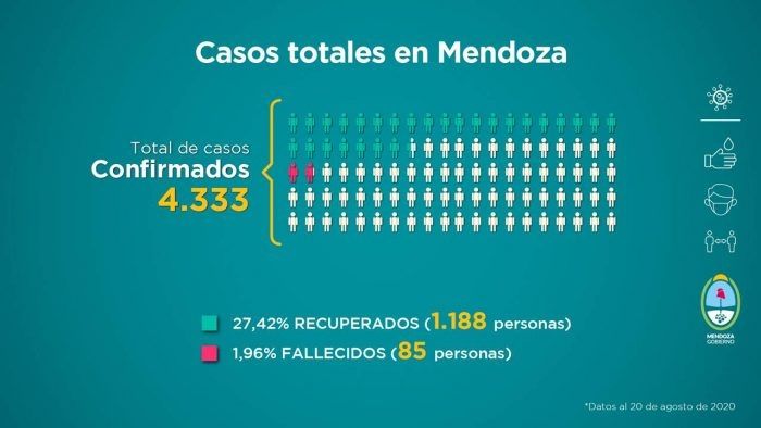 Los primeros datos que se desprenden desde que comenzó la pandemia en Mendoza son hasta las 21 de anoche: 4.333 confirmados, 1.188 recuperados y 85 fallecidos.
