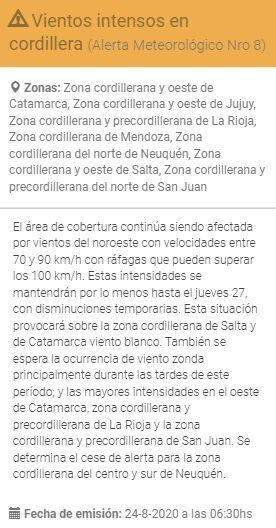 Según se remarca, la advertencia aplica para la zona cordillerana y oeste de Catamarca; zona cordillerana y oeste de Jujuy; zona cordillerana y precordillerana de La Rioja; zona cordillerana de Mendoza; zona cordillerana del norte de Neuquén; zona cordillerana y oeste de Salta; y zona cordillerana y precordillerana del norte de San Juan.