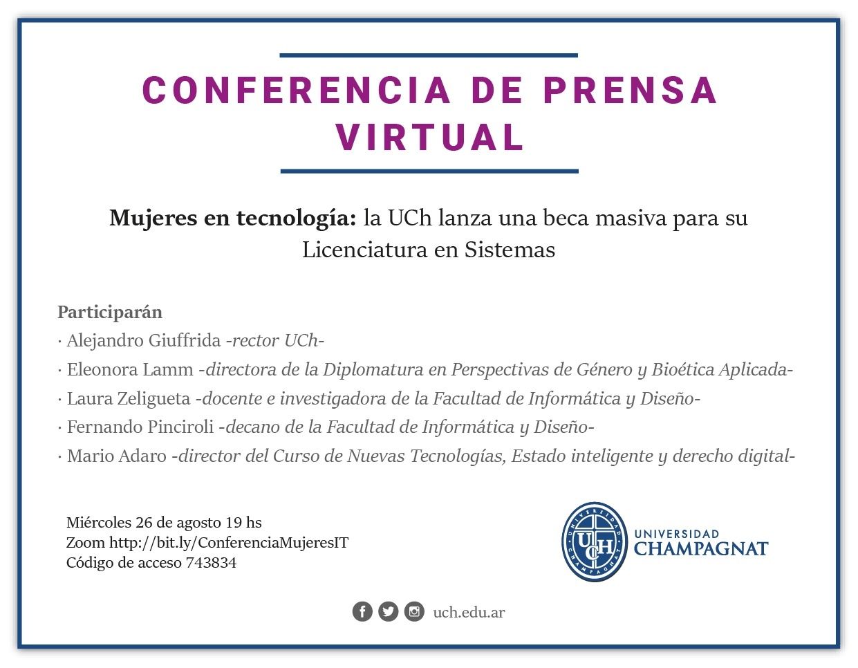 Para brindar detalles de este anuncio, este miércoles 26 de agosto a las 19 horas se realizará una videoconferencia en la que participará el rector de la Universidad Champagnat, Alejandro Giuffrida; el decano de la Facultad de Informática y Diseño, Fernando Pinciroli; la docente e investigadora de la misma Facultad, Laura Zeligueta; el director del Curso de Nuevas Tecnologías y Derecho, Mario Adaro; y la directora de la Diplomatura en Perspectivas de Género y Bioética Aplicada, Eleonora Lamm.