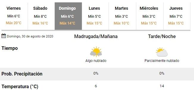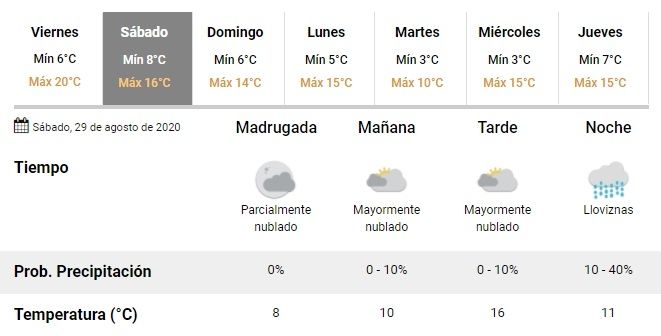 Para el sábado se espera una mínima de 8º, y una máxima de sólo 16º. Además, estará nublado la mayor parte del día, y podría haber lloviznas durante la noche