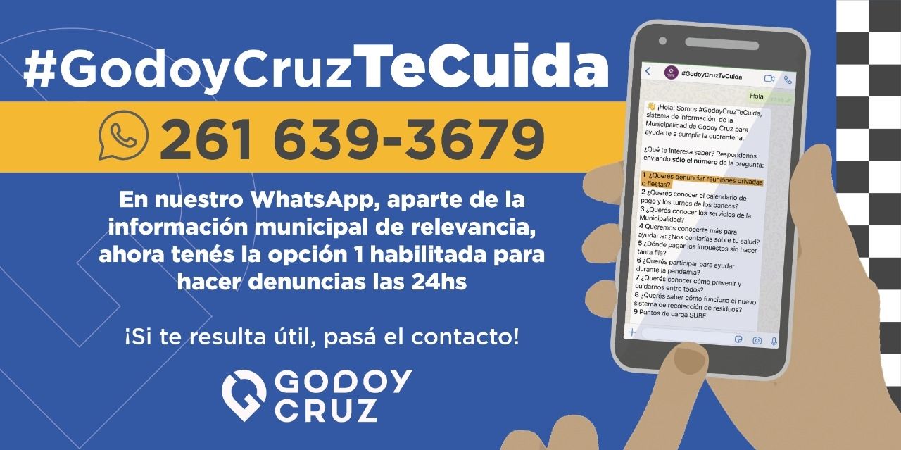 Godoy Cruz sumó una alternativa para que los vecinos realicen denuncias por reuniones clandestinas. Se trata de un número de WhatsApp, el 2616393679.