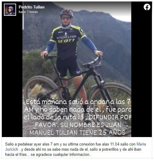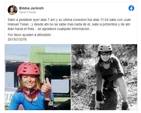 Dos ciclistas mendocinos salieron ayer a las 7 de la mañana a andar en bicicleta por Alta Montaña y no regresaban. Precisamente María Florencia Juricich y Juan Manuel Tulian partieron desde Potrerillos hacia la Ruta 13 y, al parecer, se perdieron.