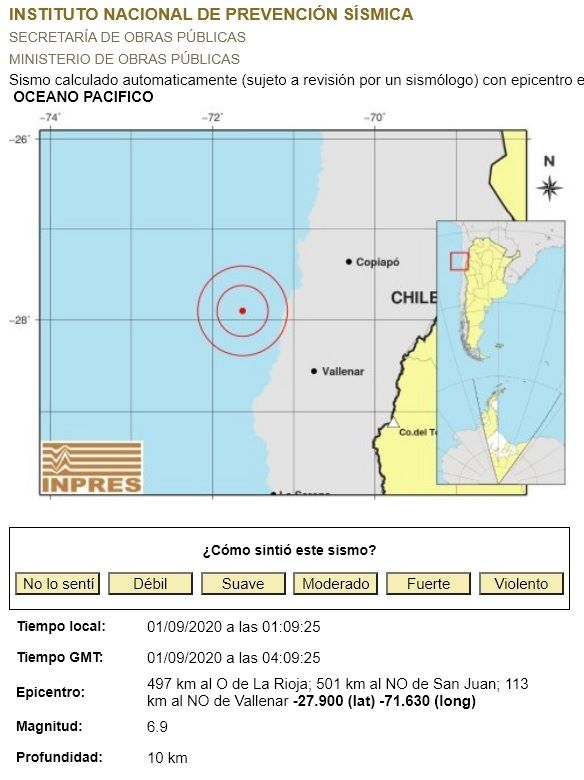 Los primeros datos del Inpres indican que el epicentro estuvo ubicado cerca de la costa de Copiapó, en Chile.
