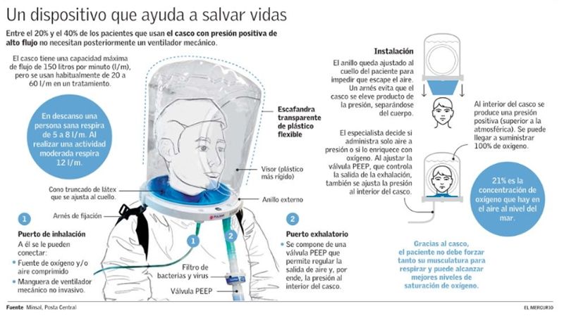 Además, estos cascos evitan la dispersión del virus a través del aire expulsado por el paciente, ya que cuentan con un filtro viral y bacteriológico. Con otros sistemas de oxigenación esa dispersión existe y causa muchos casos de enfermedad en médicos y enfermeros.