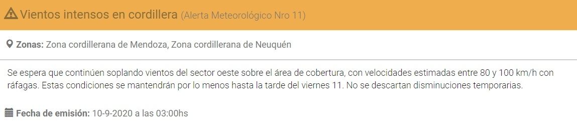 En tanto, el SMN sí mantuvo el alerta sobre vientos intensos en cordillera. "Se espera que continúen soplando vientos del sector oeste sobre el área de cobertura, con velocidades estimadas entre 80 y 100 km/h con ráfagas. Estas condiciones se mantendrán por lo menos hasta la tarde del viernes 11. No se descartan disminuciones temporarias", indicaron.