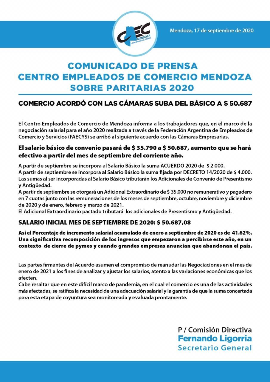 Este jueves, el Centro Empleados de Comercio emitió un comunicado donde informó sobre el resultado de las paritarias 2020 y, en el mismo, detalló que se acordó con las cámaras la suba del básico a 50.687 pesos.