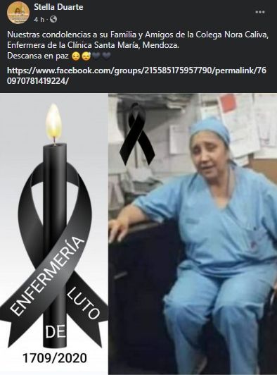 Otra enfermera mendocina murió por coronavirus y sus compañeros y amigos la despidieron con dolor en redes sociales. Se trata de Nora Caliva, enfermera de la Clínica Santa María de Ciudad que contrajo el virus en su lugar de trabajo y anoche murió luego de que se complicara su cuadro.