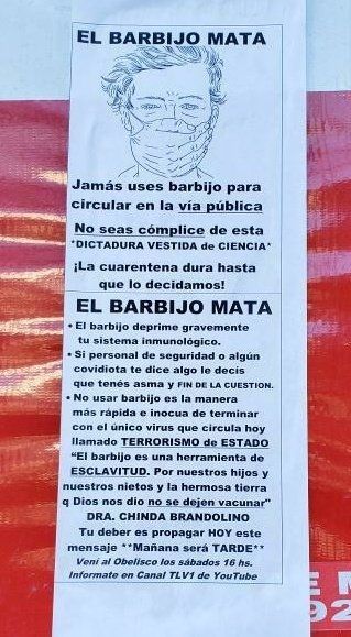 Un ejemplo de esto es el caso de Brandolino, quien convoca a juntarse todos los sábados en el Obelisco con un folleto que dice: “Jamás use barbijo para circular en la vía pública. No seas cómplice de esta dictadura vestida de ciencia. El barbijo mata”.