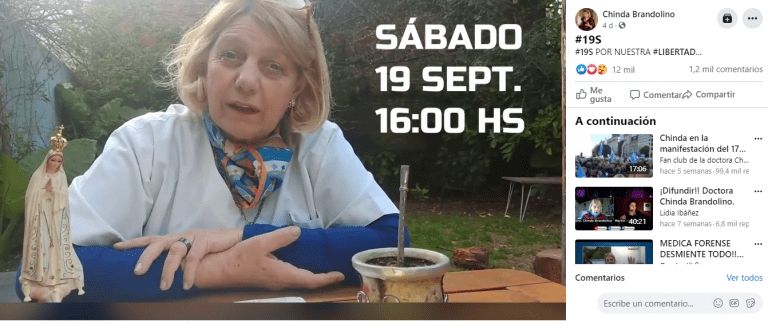 En los últimos meses se viralizaron varios videos que tienen a la médica como protagonista; el último fue el de la marcha del 17 de agosto último, en donde el grupo eligió hacer visibles sus reclamos a través de un video que contó con más de 45 mil reproducciones en Facebook. En la grabación, la médica expone muchas desinformaciones: que “el virus existió siempre”, que “el SARS-CoV-2 fue modificado genéticamente”, que “el coronavirus se puede combatir con el dióxido de cloro” y que la “PCR da 50% de falsos positivos”.