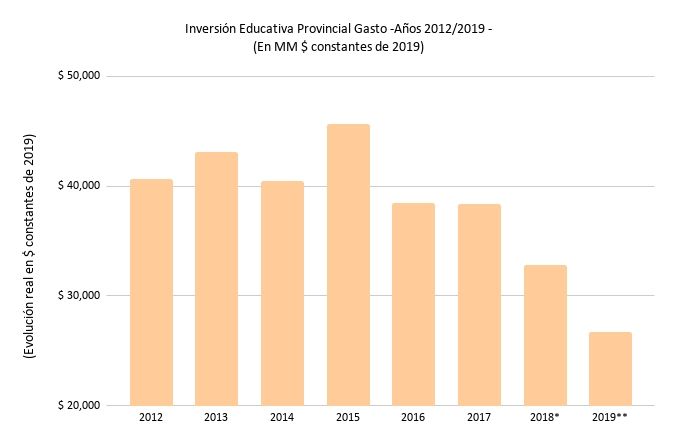 Tanto para esta administración como para la anterior del mismo signo político, la educación no fue una prioridad en ninguno de sus 5 presupuestos. En 2015, cuando el peronismo entregó el gobierno, el área Educación alcanzó el 29,8% del (mal llamado) gasto público. Cuando Suárez asumió ese número se había derrumbado a 18,4% según se reconoció en la llamada ley de leyes.