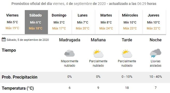 Para este sábado, el Servicio Meteorológico Nacional indica que la mínima será de 6º durante la mañana, mientras que la máxima rondará los 18º. Si bien durante el día estará parcialmente nublado, por la noche hay pronóstico de lluvias aisladas.