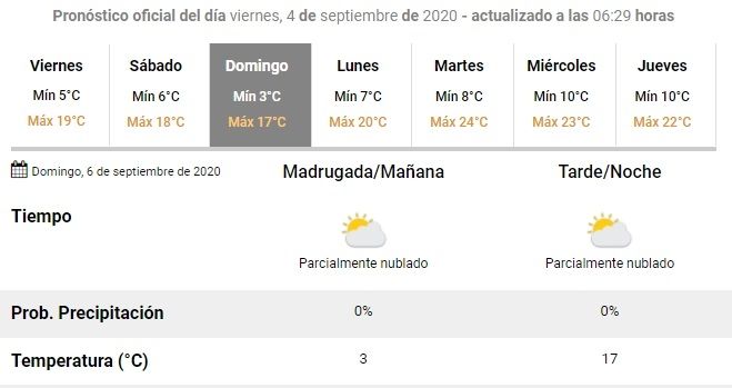 El domingo, en tanto, la mínima será de 3º y la máxima de 17º. A diferencia del domingo, estará soleado durante toda la jornada, aunque algo ventoso.