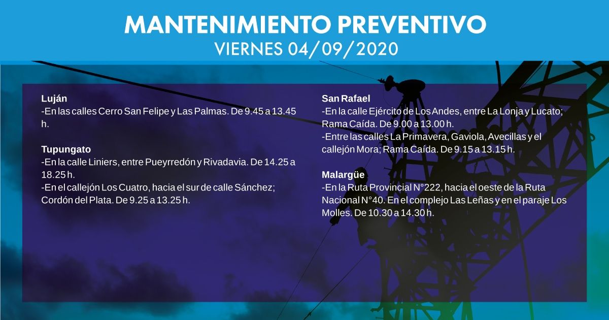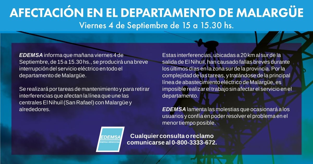 Hoy habrá afectación del servicio eléctrico en las siguientes zonas y horarios. Estas tareas de Edemsa se realizan bajo los protocolos sanitarios establecidos por el Covid-19.