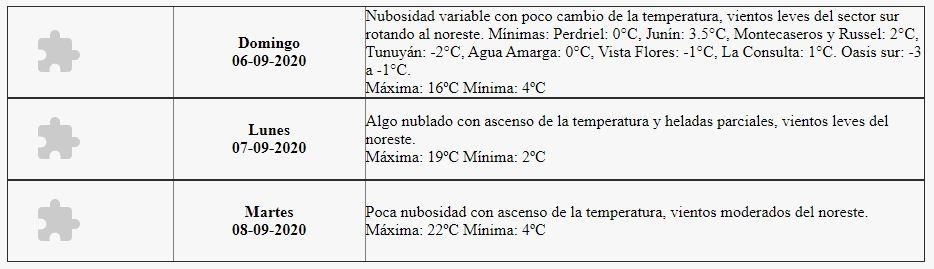 El lunes estará "algo nublado con ascenso de la temperatura y heladas parciales, vientos leves del noreste". La máxima será de 19 grados.
