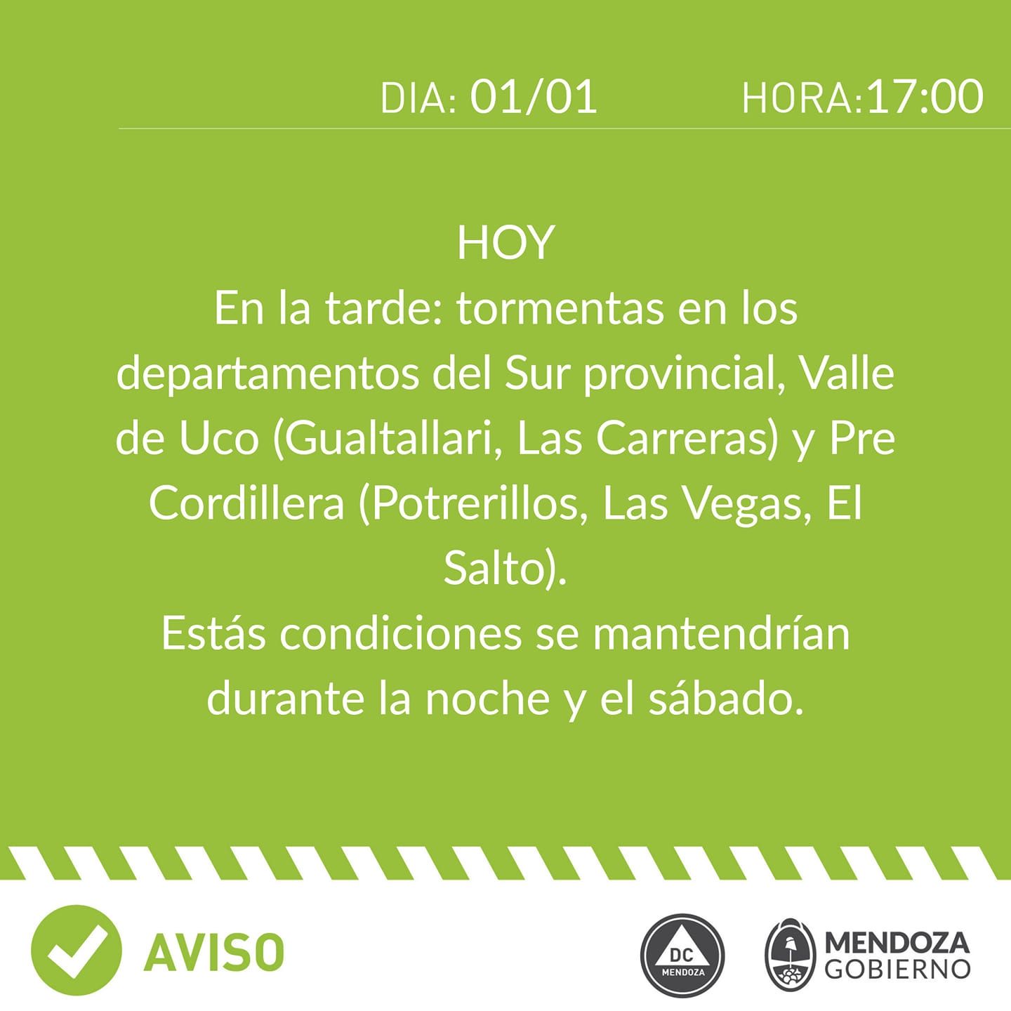 En el comunicado, Defensa Civil advierte que "en la tarde podrían haber tormentas en los departamentos del Sur provincia, Valle de Uco (Gualtallari, Las Carreras) y Pre Cordillera (Potrerillos, Las Vegas, El Salto). Estas condiciones se mantendrían durante la noche y el sábado".