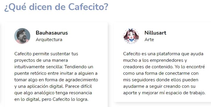 Cafecito es una plataforma de crowdfunding (financiación colectiva) que tiene como misión unir a ONG, creadores de contenido o cualquiera que necesite apoyo en un proyecto. El aporte consiste en donar simbólicamente el equivalente a un café, precisamente (la donación base está entre los $50 a $100). De ahí en más, lo que la generosidad del contribuyente esté dispuesta a sumar.