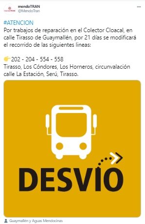 Concretamente se trata de las líneas 202, 204, 554 y 558 que modificarán su recorrido en Guaymallén a la altura de calle Tirasso. La decisión es consecuencia de trabajos de reparación en el Colector Cloacal en aquel departamento.