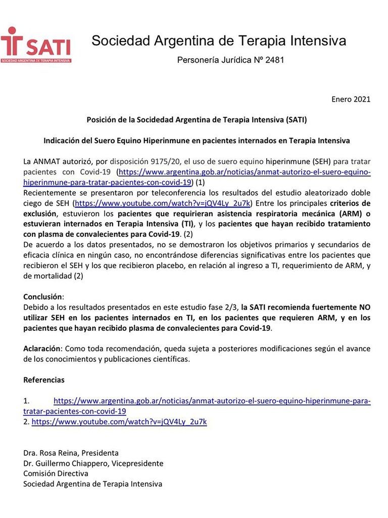 La Sociedad Argentina de Terapia Intensiva (SATI) emitió hoy un comunicado recomendando fuertemente no utilizar suero equino hiperinmune (SEH) en los pacientes internados en terapia intensiva, en los pacientes que requieren asistencia respiratoria mecánica y en los pacientes que hayan recibido plasma de convalecientes para covid-19.