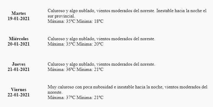 "Caluroso y algo nublado, vientos moderados del noreste. Inestable hacia la noche el sur provincial", indica el pronóstico, al tiempo que detalla que la mínima será de 18.
