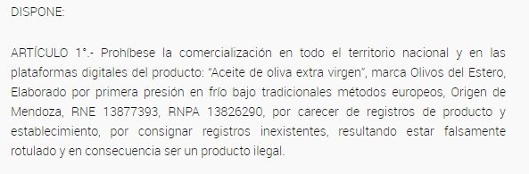 A través de la disposición 555/2021, la Anmat prohibió la comercialización en todo el territorio nacional y en las plataformas digitales del producto "Aceite de oliva extra virgen', marca Olivos del Estero. Según consigna la Anmat, el producto es elaborado por primera presión en frío bajo tradicionales métodos europeos y proviene de Mendoza. El aceite fue prohibido por "carecer de registros de producto y establecimiento y por consignar registros inexistentes".