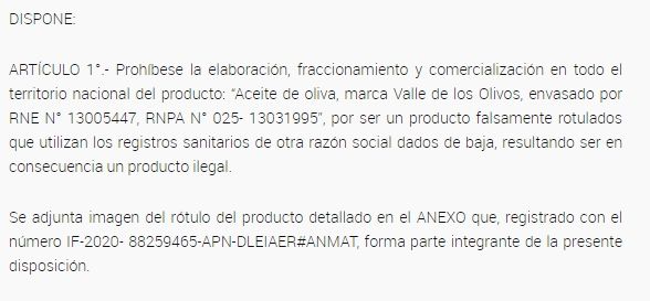 En tanto el organismo también prohibió el aceite de oliva marca "Valle de los Olivos" por encontrarse falsamente rotulado. Según se expuso, el producto presentaba "registros sanitarios de otra razón social dados de baja".