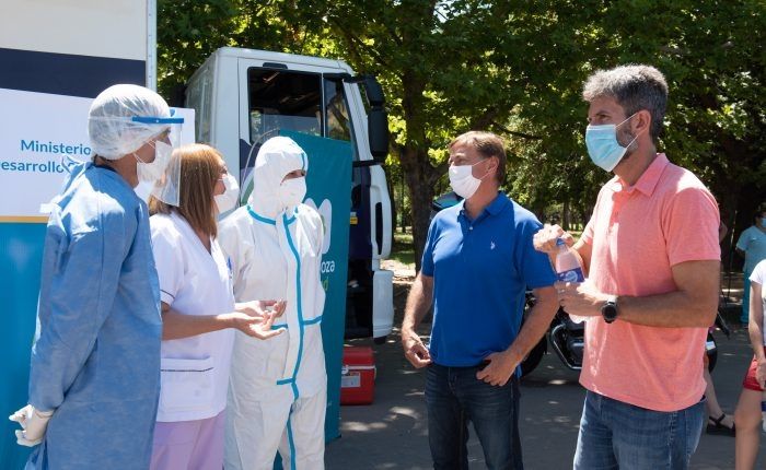 Rodolfo Suarez, gobernador de Mendoza, recorrió este sábado junto al intendente Ulpiano Suarez y a la ministra de Salud, Ana María Nadal, el camión de testeo rápido ubicado en la Fuente de los Continentes del Parque General San Martín.
