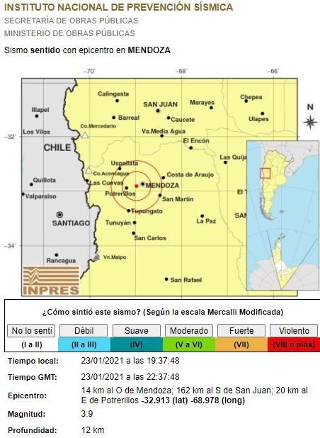 Enero viene movido y por segunda vez en el mes la tierra vibró fuerte. Lectores de MDZ informaron que se sintió mucho, especialmente en los edificios. Ocurrió a las 19.37 y el epicentro estuvo a 22 kilómetros de la Ciudad, muy cerca de Potrerillos.