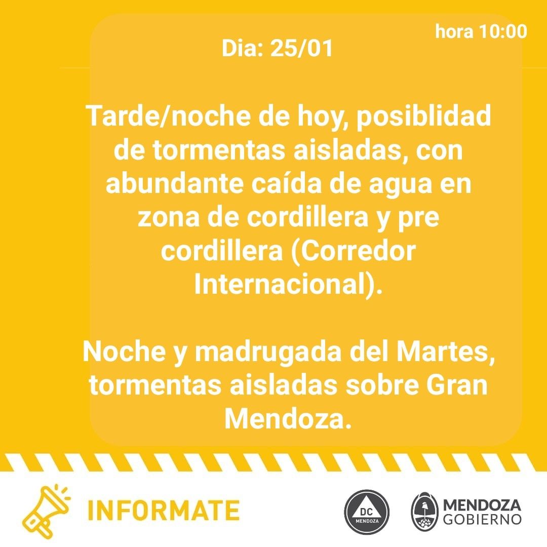 Además, el alerta advierte sobre la posibilidad de "tormentas aisladas con abundante caída de agua en la zona de cordillera y pre cordillera (Corredor Internacional)".
