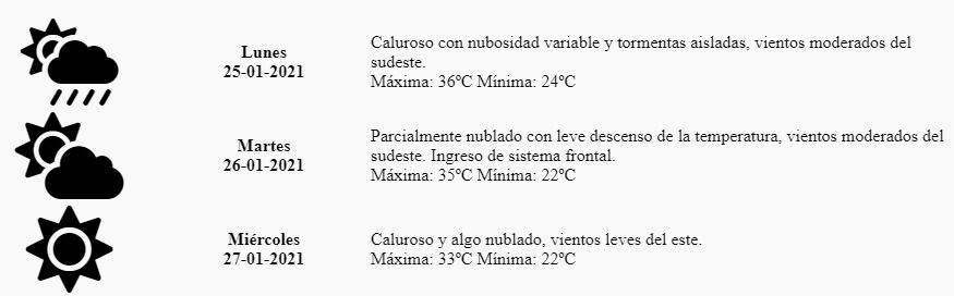 El pronóstico de la Dirección de Contingencias Climáticas indica que para hoy se espera que esté caluroso con nubosidad variable y tormentas aisladas, mientras que para mañana se espera un leve descenso de la temperatura con el ingreso de un sistema frontal. La mínima para hoy será de 24°C y la máxima de 36°C.