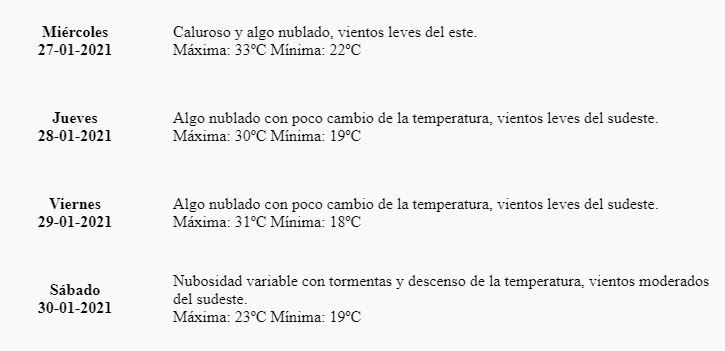 "Caluroso con nubosidad variable y tormentas aisladas, vientos moderados del sudeste", indica el pronóstico.