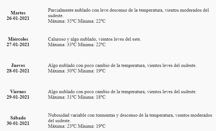 "Parcialmente nublado con leve descenso de la temperatura, vientos moderados del sudeste", dice el pronóstico. La máxima estimada será de 35 grados centígrados.