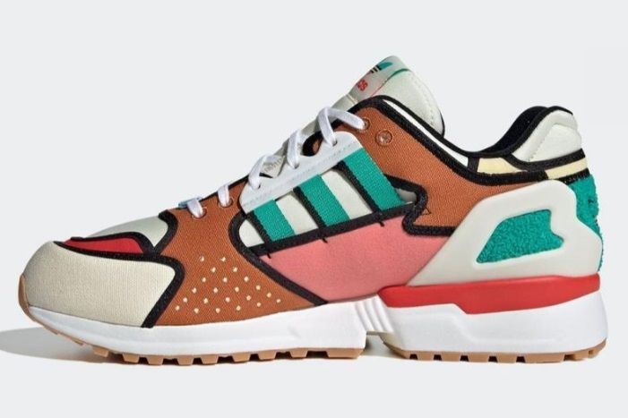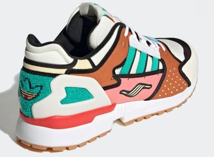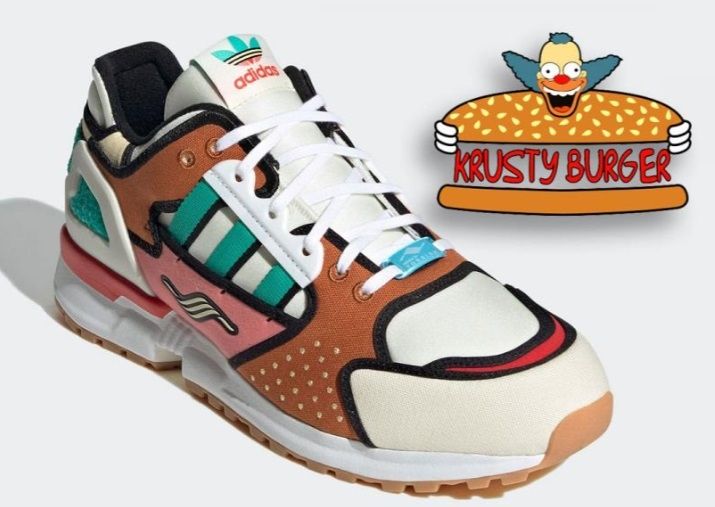 Los colores de las zapatillas están inspirados en la gama del Krusty Burger y las líneas negras representan la perfección de la serie. El diseño que eligió Adidas es la base de unas ZX 10000, las pintaron con los colores verde, rosa, rojo, marrón, vainilla y blanco, y tienen placas de gamuza.