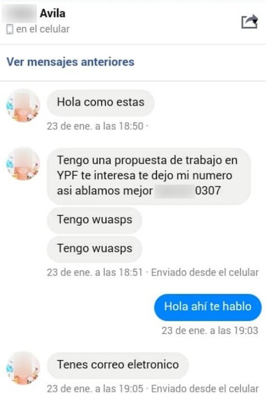 Daniela Araujo es mamá sola, tiene 23 años y busca trabajo. Días atrás, un hombre le mandó una solicitud de amistad por Facebook y ella lo aceptó. Empezaron a chatear: "Me escribió diciendo que podía conseguirme un trabajo en YPF. Yo le contesté que estaba interesada, entonces él me dio un número de Whatsapp y me pidió un correo electrónico para que se contactara conmigo un tal Mario Campos". Era el anzuelo de la estafa.
