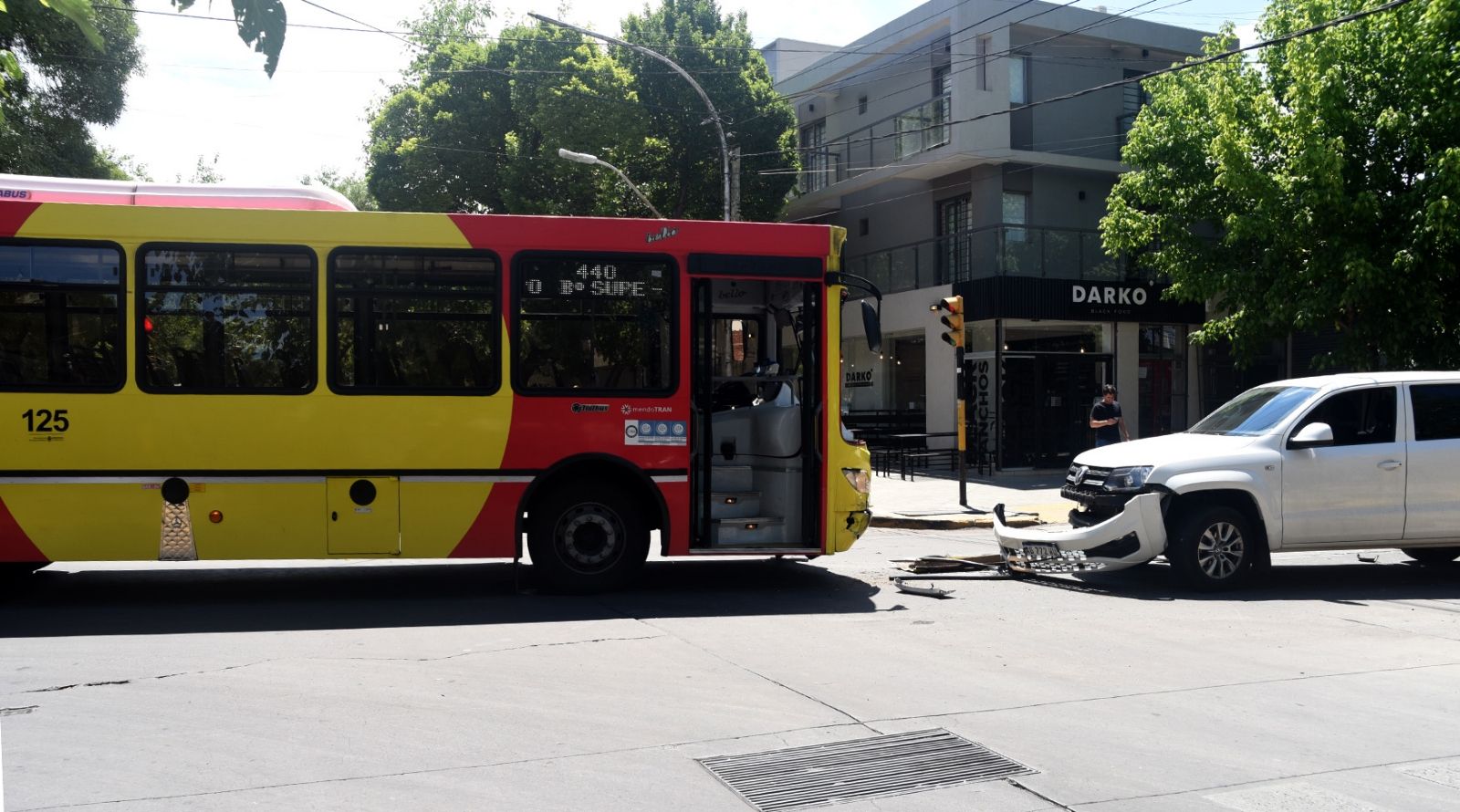 Cerca de las 15, en Paso de Los Andes y Lamadrid, un micro del Grupo 440, interno 125, chocó contra una camioneta Volkswagen Amarok. Si bien el impacto fue fuerte, no hubo heridos.