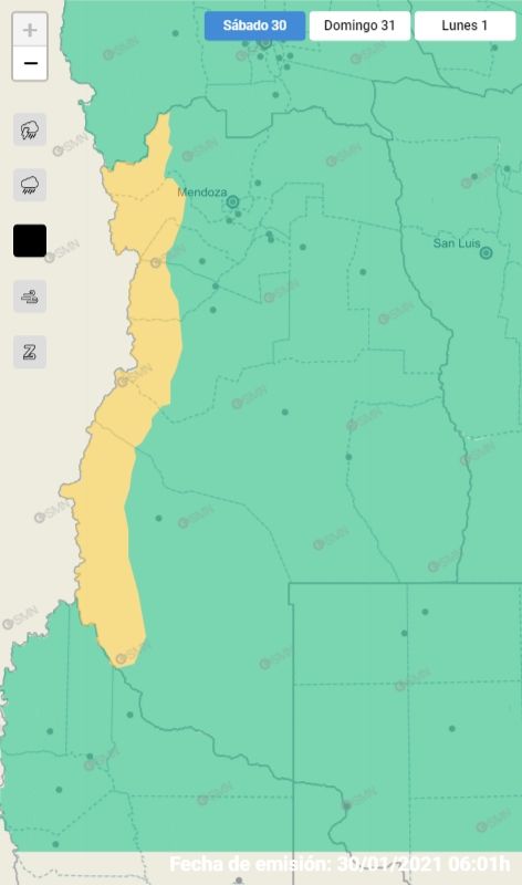 En el Sistema de Alerta Temprana, el organismo emitió una advertencia para las áreas montañosas de los departamentos de Las Heras, Luján de Cuyo, Tupungato, Tunuyán, San Carlos, San Rafael y Malargüe, donde se pronosticaron precipitaciones en forma de agua y nieve para este fin de semana.